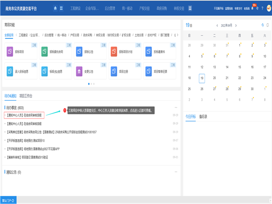 中標(biāo)單位簽署完成提交流程后中心人員即可在代辦事宜中收到代辦消息。