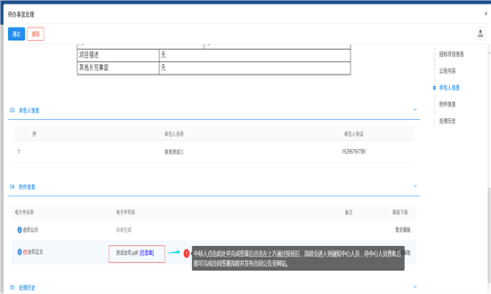 中標(biāo)人進(jìn)入合同頁面后點擊合同正文中的附件并完成簽章,簽章完成后點擊通過按鈕即可將流程提交給中心人員。