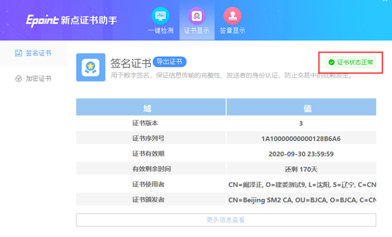 如果“證書檢測(cè)結(jié)果”中顯示證書狀態(tài)正常,則表示您的證書Key是可以正常使用的,如下圖: