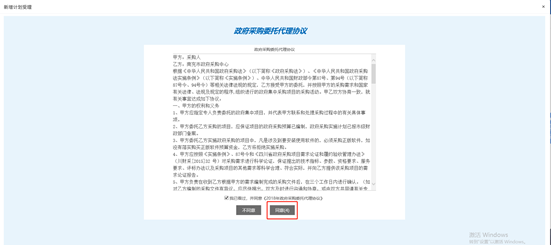 2、點(diǎn)擊【新增計(jì)劃受理】進(jìn)入該頁(yè)面,閱讀政府采購(gòu)委托代理協(xié)議,點(diǎn)擊【同意】按鈕,如下圖: